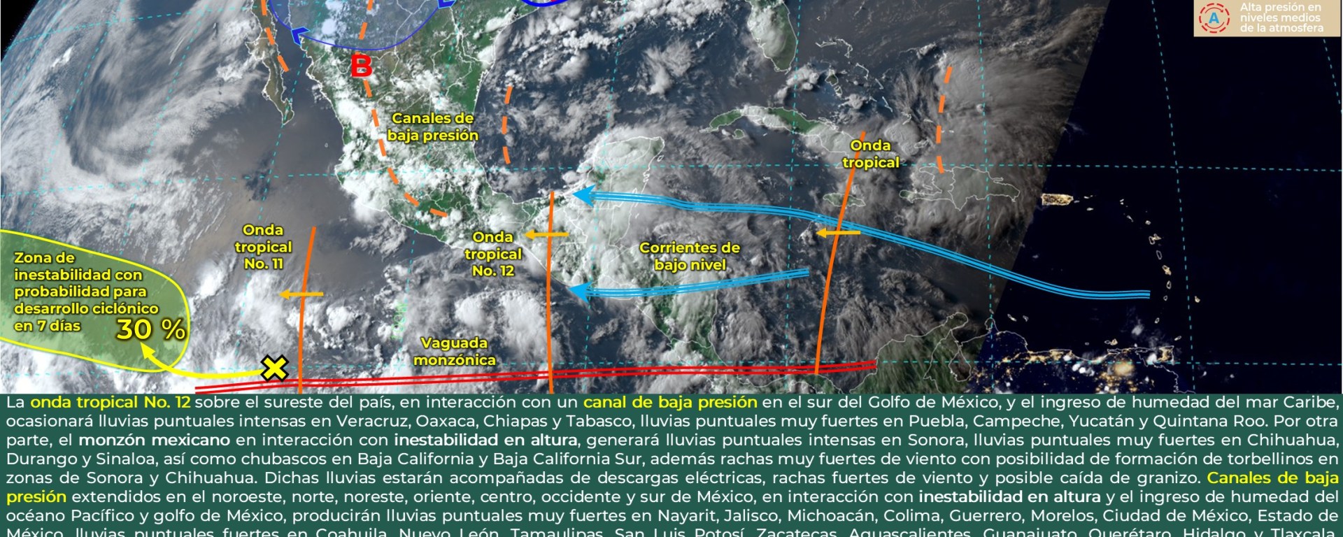 Intervalos de chubascos con lluvias puntuales fuertes (25 a 50 mm): Coahuila, Nuevo León, Tamaulipas, San Luis Potosí, Zacatecas, Durango, Sinaloa, Nayarit, Jalisco, Colima, Guanajuato, Querétaro, Hidalgo, Tlaxcala, Campeche, Yucatán y Quintana Roo.