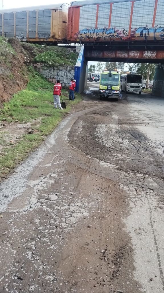 En el Puente Pemex, en Salvador Nava Martínez, los trabajos han sido particularmente intensivos debido a la gran acumulación de lodo y residuos. Por ello, también se ha recurrido al barrido manual para retirar rocas y basura, acompañado de barrido mecánico para una limpieza más profunda de los lodos.
