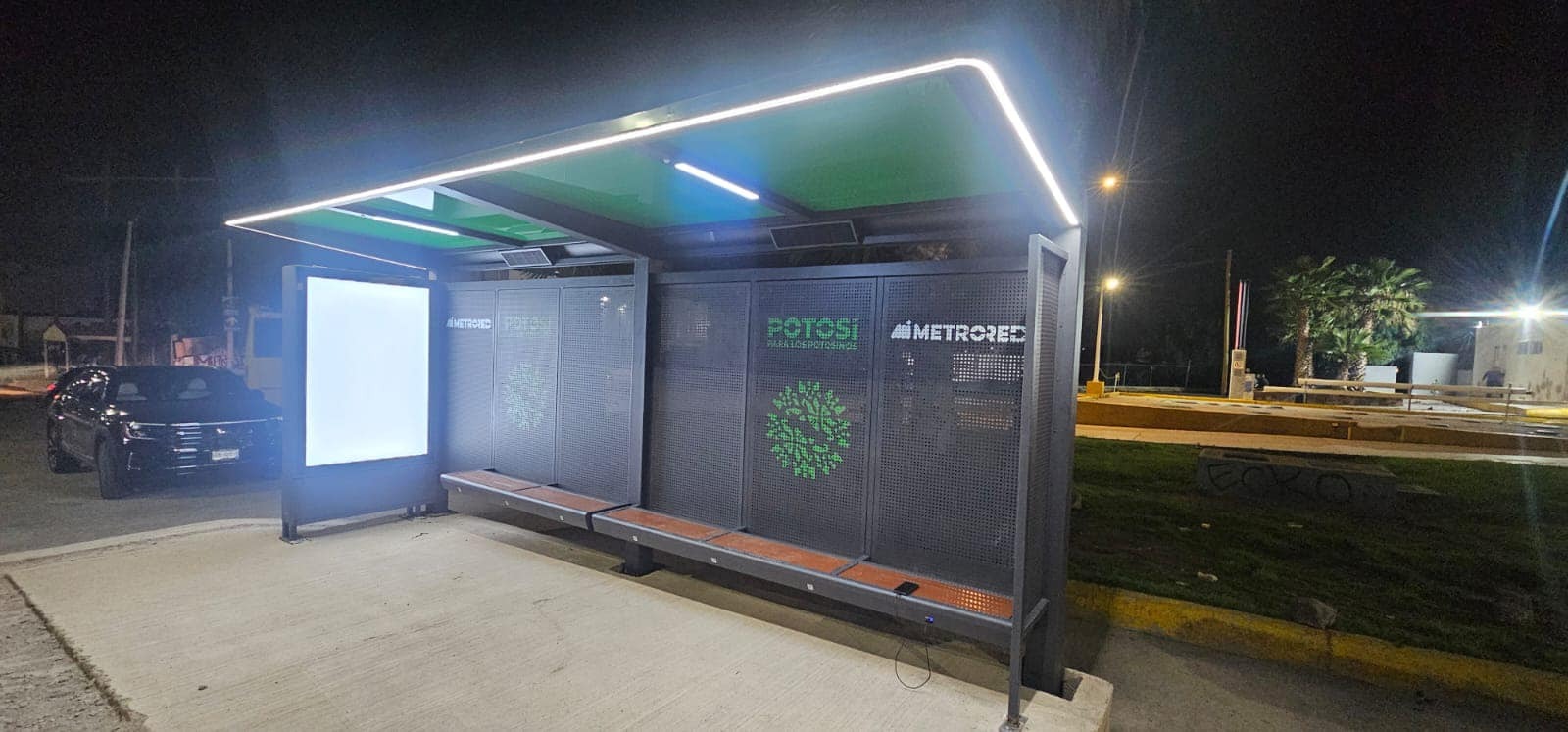 La SCT continúa con la supervisión de las obras para que en próximos días arranque la nueva línea, que proporcionará servicio a las y los usuarios potosinos, con la instalación de los primeros paradores de la línea en el área circundante a la Feria Nacional Potosina (Fenapo), los cuales ahora contarán con paneles solares para que brinden iluminación, además de conectores para que las y los usuarios puedan cargar sus dispositivos, por lo que se cumple un compromiso más del Gobernador Ricardo Gallardo Cardona, de ofrecer un servicio de calidad para las y los potosinos.