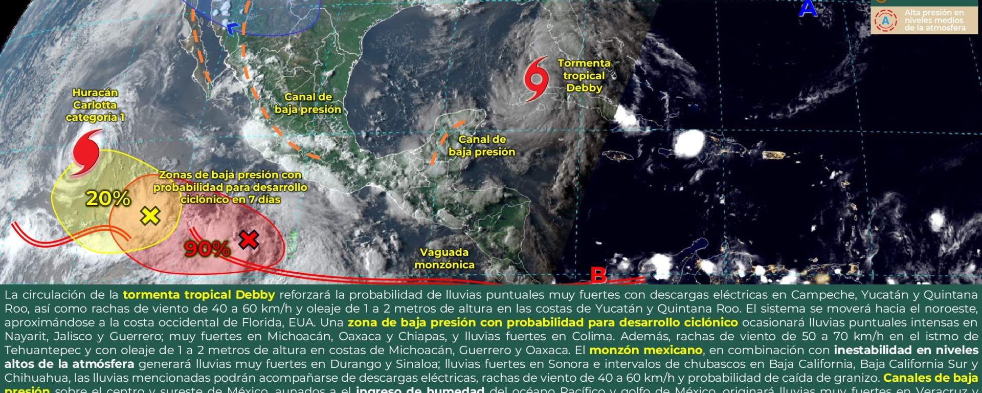 Intervalos de chubascos con lluvias puntuales fuertes (25 a 50 mm): Sonora, Durango, Sinaloa, Nayarit, Jalisco, Colima, Michoacán, Estado de México, Morelos, Puebla, Veracruz, Tabasco, Campeche, Yucatán y Quintana Roo.