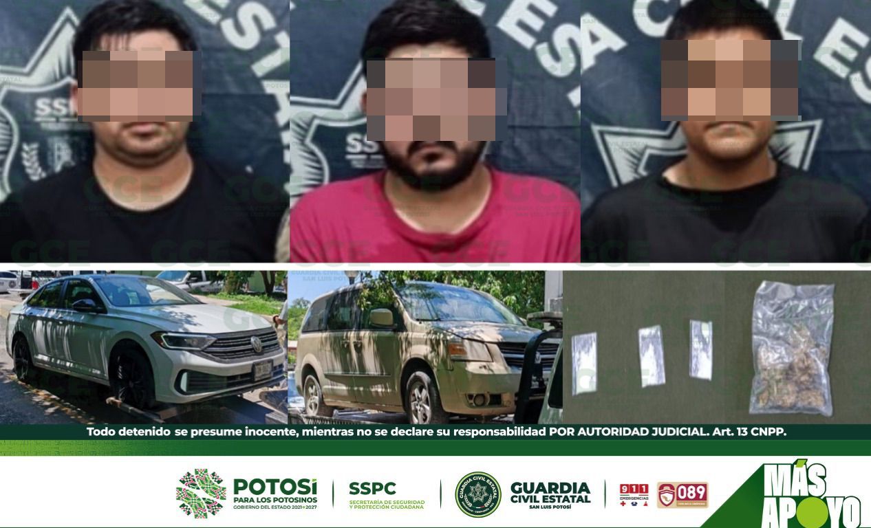 Ciudad Valles, S.L.P.- Acciones operativas de la Guardia Civil Estatal (GCE) derivaron en el auxilio de una persona, quien indicó haber sido privado de su libertad por tres masculinos, quienes luego de un fuerte dispositivo en la zona, fueron capturados con dosis de droga y dos vehículos.