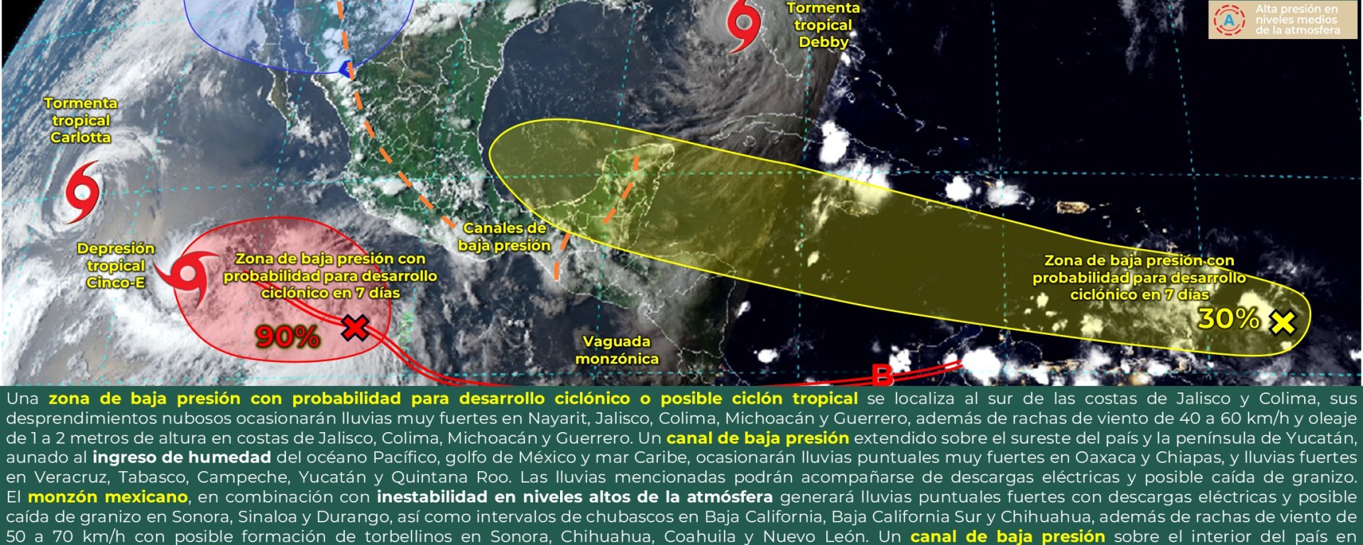 Intervalos de chubascos con lluvias puntuales fuertes (25 a 50 mm): Durango, Nayarit, Jalisco, Colima, Michoacán, Estado de México, Veracruz y Tabasco.