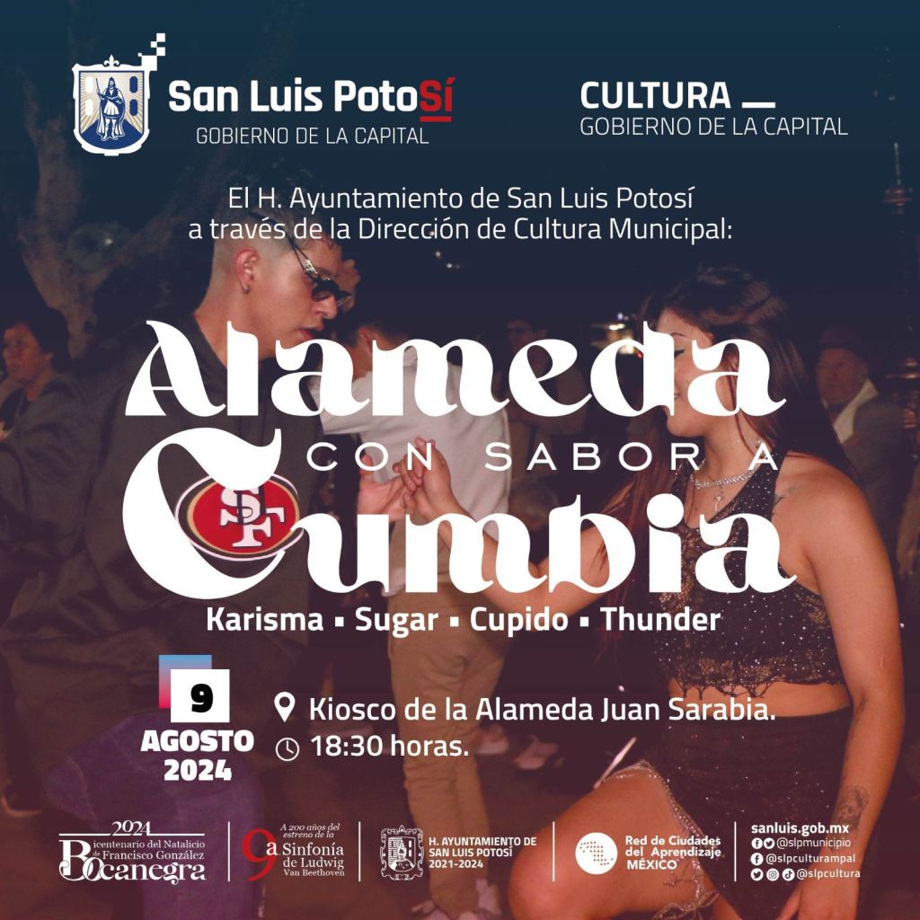 Debido al éxito de la edición anterior, el gobierno municipal de San Luis Capital a través de la dirección de Cultura ofrece de nueva cuenta el espectáculo gratuito “Alameda con sabor a Cumbia”, este viernes 9 de agosto a partir de las 18:30 horas en el quiosco del emblemático parque público.