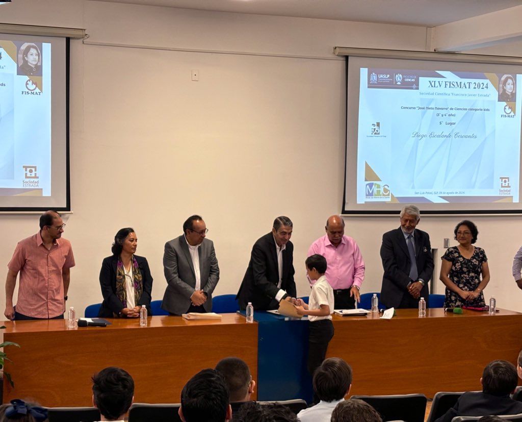 Este día se llevó a cabo la ceremonia de entrega de reconocimientos y premiación a niños y jóvenes que participaron en el XLV Concurso Regional Pauling de Física y Matemáticas FIS-MAT 2024, organizado por la Sociedad Científica “Francisco Javier Estrada”, con el aval de la Universidad Autónoma de San Luis Potosí (UASLP), en esta edición, en honor a la maestra Edith Miriam Soto Pérez.