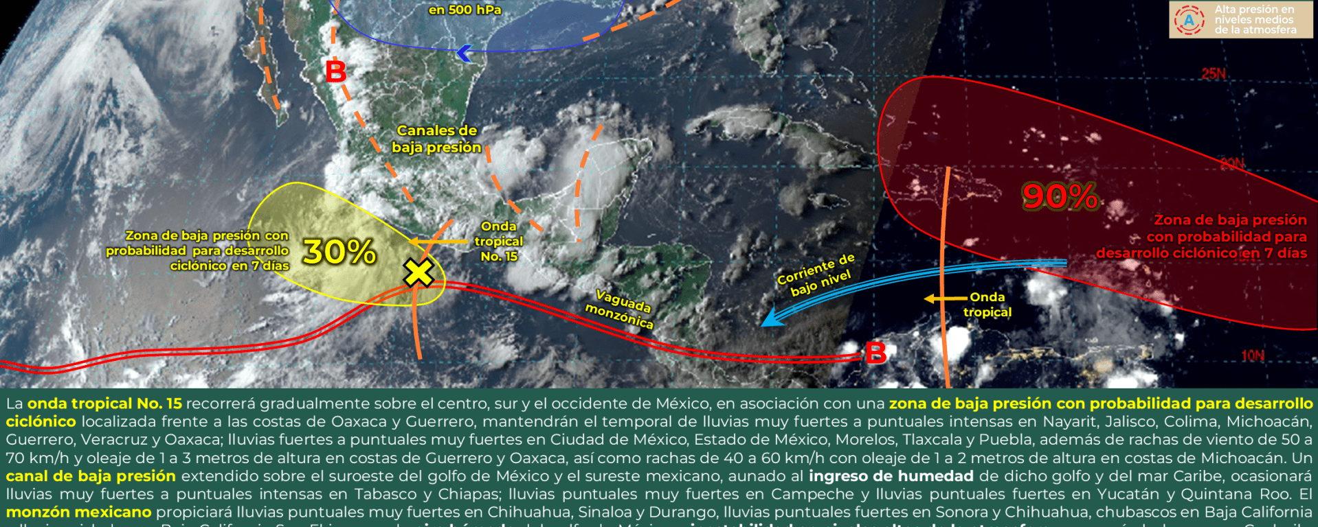 Intervalos de chubascos con lluvias puntuales fuertes (25 a 50 mm): Tamaulipas, San Luis Potosí, Hidalgo, Tabasco, Campeche, Yucatán y Quintana Roo.