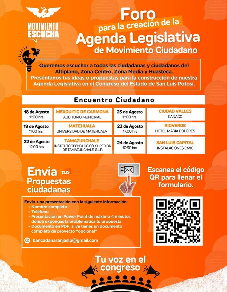 Informó que la agenda de los Foros para la creación de la Agenda Legislativa de MC se desarrollará de la siguiente manera, el domingo 18 de agosto arrancan en Mexquitic de Carmona, el 19 en Matehuala, el 22 de agosto en Tamazunchale, el 23 de agosto en Ciudad Valles y Tamazunchale y el 24 de agosto en San Luis Potosí.