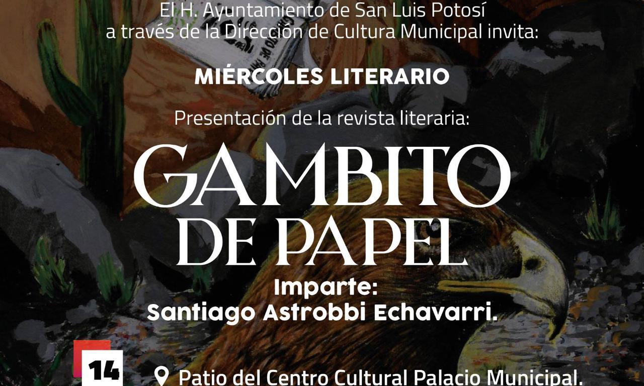 El Gobierno Municipal de San Luis Potosí, a través de la Dirección de Cultura Municipal, se complace en invitar a todos los ciudadanos al Miércoles Literario. En esta ocasión, se realizará la presentación de la revista literaria «Gambito de Papel».