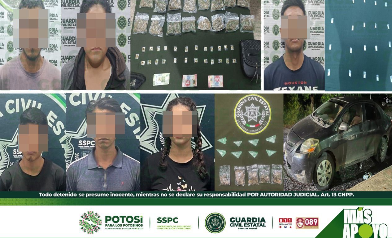 Resultado del Plan Integral de Seguridad, desdoblado en las cuatro regiones del territorio potosino para el combate al narcomenudeo, agentes de la Guardia Civil Estatal (GCE) detuvieron a seis presuntos vendedores de droga, vinculados a redes criminales, logrando asegurar 74 dosis de diferentes enervantes.