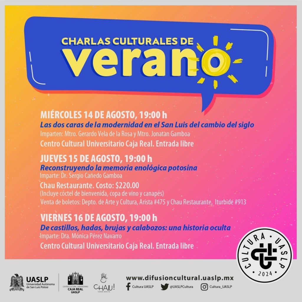 La Secretaría de Difusión Cultural de la Universidad Autónoma de San Luis Potosí (UASLP) impartirá del 14 al 16 de agosto las “Charlas Culturales de Verano”, organizadas por el Departamento de Arte y Cultura (DAC), las cuales se llevarán a cabo a las 19:00 horas en dos sedes.