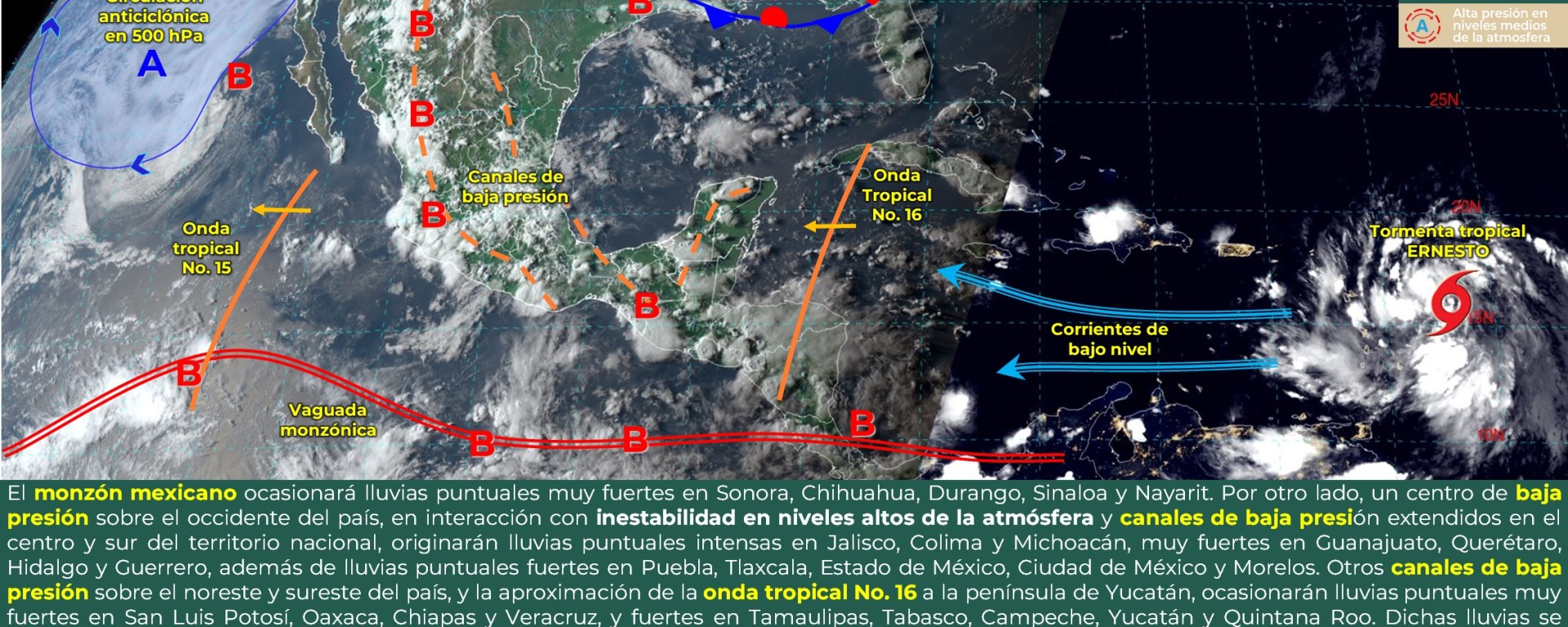 Lluvias fuertes con puntuales muy fuertes (50 a 75 mm): Sonora, Chihuahua, Durango, Colima, Michoacán, Guerrero, Morelos, Puebla, Veracruz, Campeche, Yucatán y Quintana Roo.