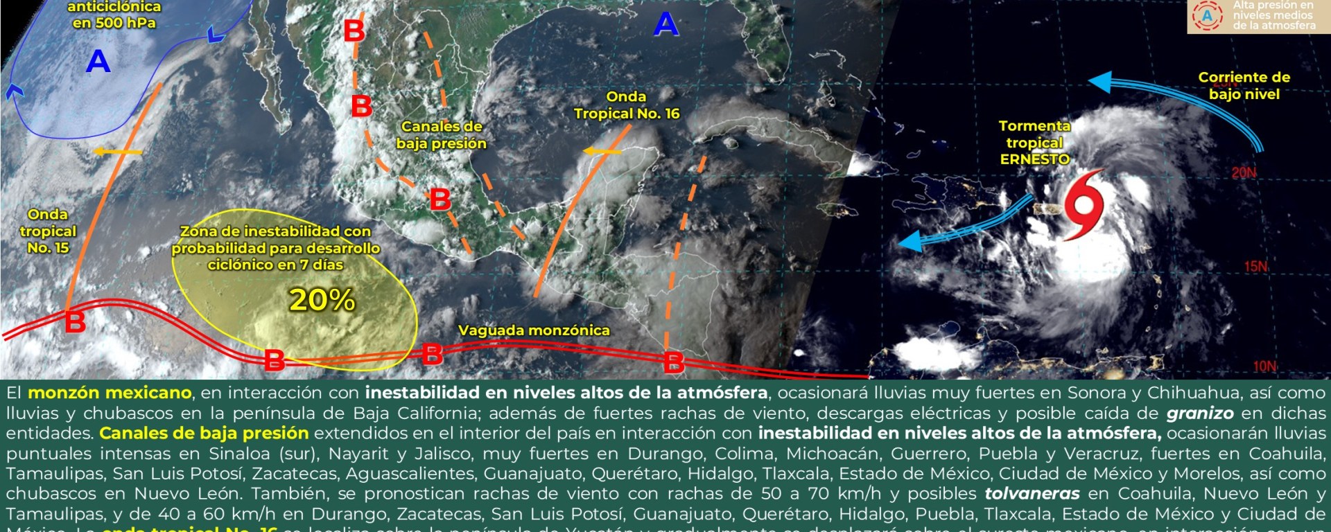 Intervalos de chubascos con lluvias puntuales fuertes (25 a 50 mm): Sonora, Chihuahua, Durango, Zacatecas, Aguascalientes, Sinaloa, Nayarit, Colima, Guanajuato, Estado de México, Ciudad de México, Morelos y Quintana Roo.