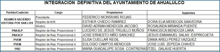 Ante estos resultados no se requirió realizar ningún ajuste paritario, por lo que la integración definitiva del Ayuntamiento de Ahualulco queda integrada de la siguiente manera.