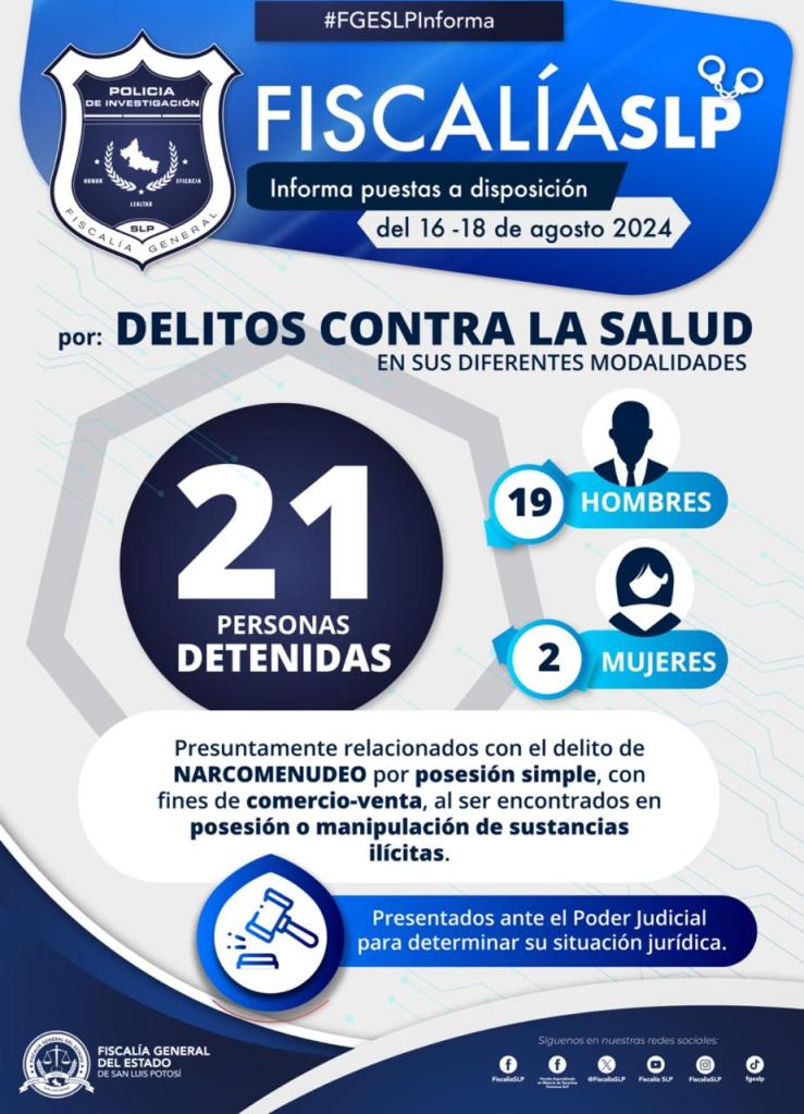 Durante el fin de semana la Fiscalía General del Estado de San Luis Potosí (FGESLP) puso a disposición de un Juez de control a 21 personas detenidas por delitos contra la salud en sus diferentes modalidades en la Zona Metropolitana.