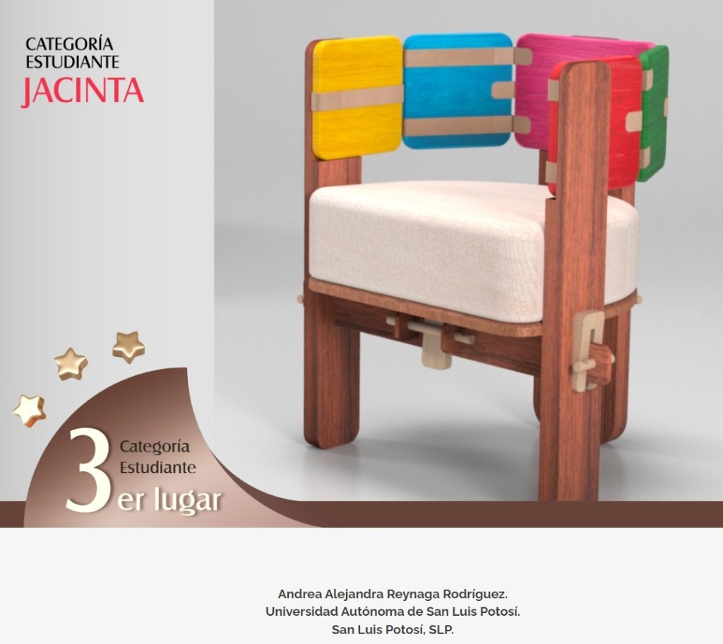 Para este año, el tema del concurso fue “Reinventando la silla”, por lo que el proyecto de la joven universitaria estuvo inspirado en los juguetes mexicanos de madera, que tienen cintas entrelazadas y que se caracterizan por su diversidad de colores.