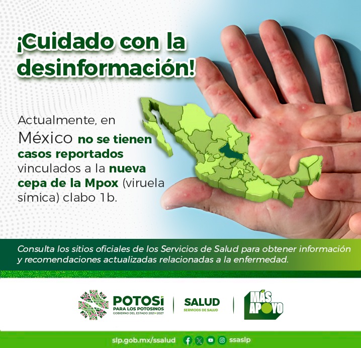 Mencionó que no hay aún en México, ni en San Luis Potosí casos de la variante Clado I, que es por la cual se generó el aviso epidemiológico y la emergencia sanitaria internacional; en las unidades médicas se cuenta con las acciones de vigilancia epidemiológica para garantizar la detección y la atención oportuna de personas que resulten infectadas, los síntomas que caracterizan la enfermedad, son: fiebre, dolor de cabeza, agotamiento, dolores musculares, inflamación de los ganglios linfáticos, manifestándose en áreas del cuello, axilas, región inguinal, entre otras; lesiones en la piel, en forma de erupciones que suelen aparecer primero en cara y manos para después extenderse al resto del cuerpo, pero también pueden aparecer inicialmente en los genitales o en otras partes del cuerpo.