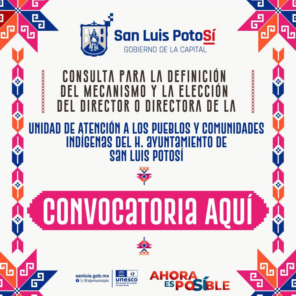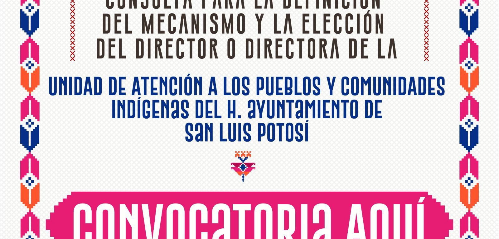 El Ayuntamiento de San Luis Potosí da a conocer la consulta a las comunidades y pueblos indígenas con asentamiento, presencia histórica y vigente en el Municipio, sobre el mecanismo que consideren conveniente y acuerden por unanimidad o mayoría, para definir la elección de la Directora o Director de la Unidad Especializada de Atención a los Pueblos y Comunidades Indígenas.