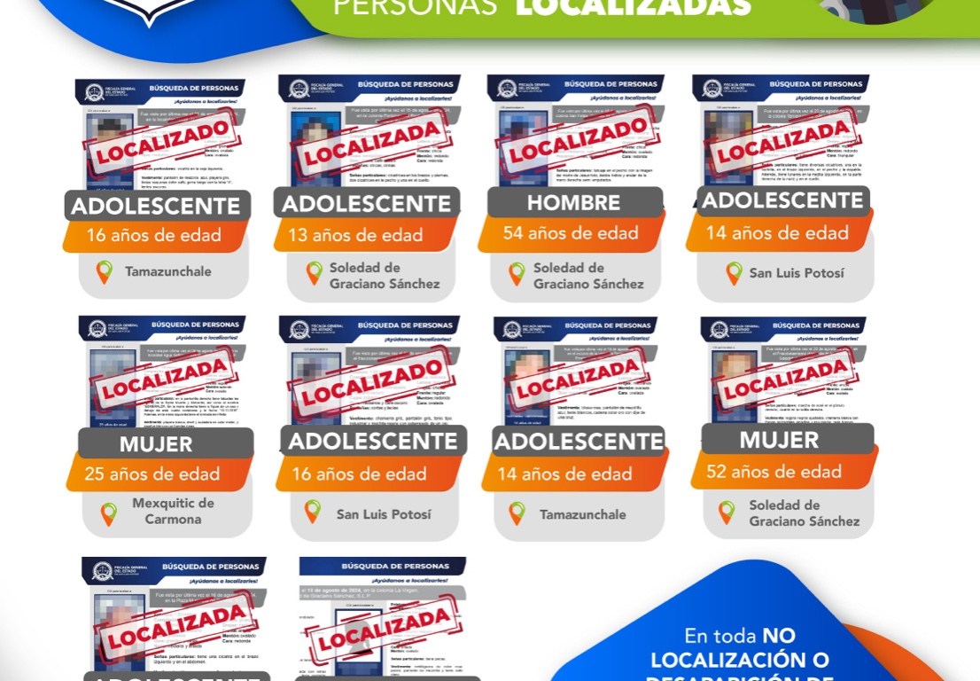 Durante el periodo del 16 al 22 de agosto de 2024, se logró la localización de 10 personas: 7 mujeres y 3 hombres. Las personas localizadas son: Evelyn, de 12 años; Diana y Raquel, de 14 años; Wendolyn, de 15 años; Avril, Alan y Óscar, de 16 años; Elizabeth, de 25 años; Verónica, de 52 años; y José Carmen, de 54 años.