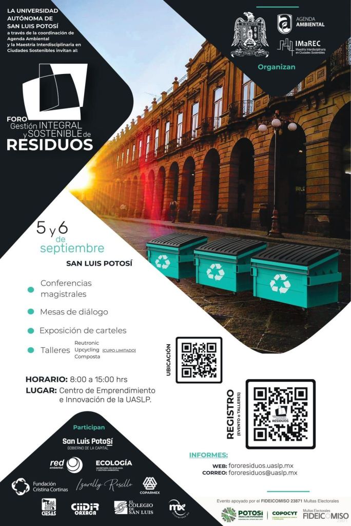 Los días jueves 05 y viernes 06 de septiembre del 2024, la Agenda ambiental UASLP y la Maestría Interdisciplinaria en Ciudades Sostenibles (IMaREC), llevarán a cabo por primera ocasión en las instalaciones del Centro de Emprendimiento e Innovación de la UASLP, el foro: “Gestión Integral y Sostenible de Residuos”, el cual será de acceso libre para todo público.