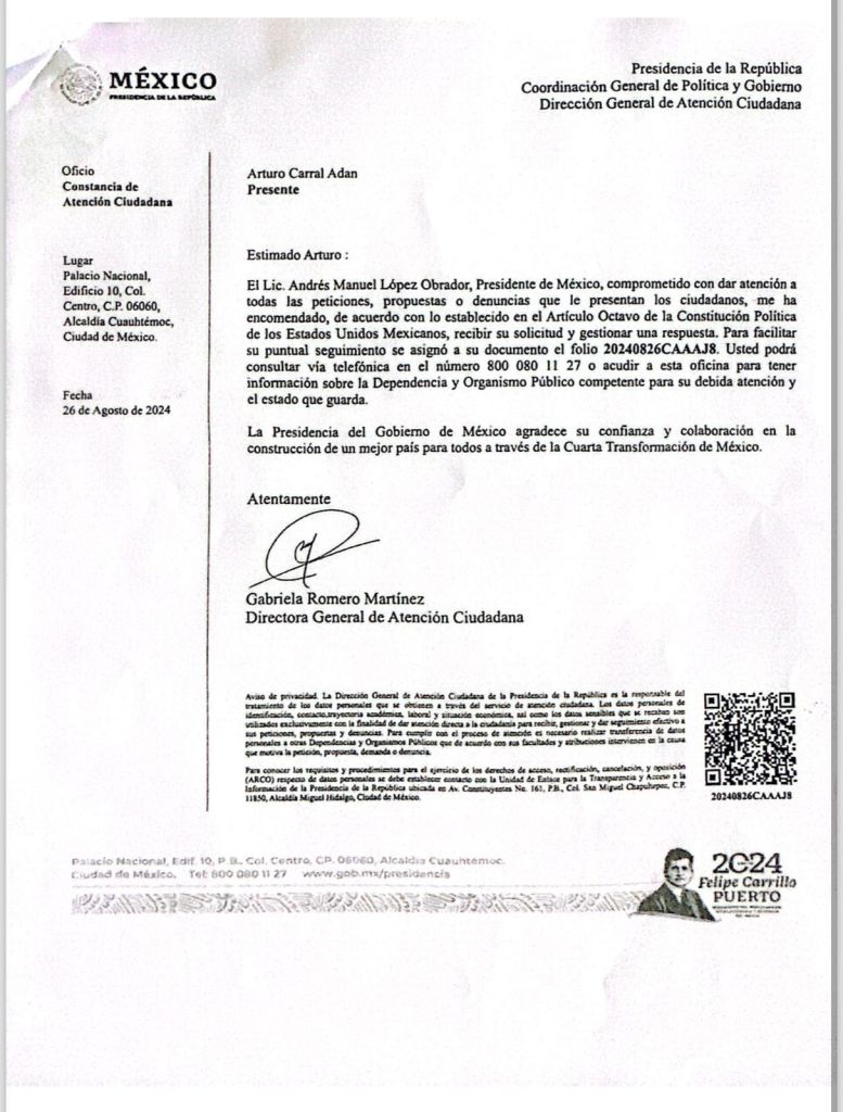 «Gabriela Romero Martínez, directora de Atención Ciudadana de la Presidencia de la República, nos respondió que la gestión que emprendimos será asignada en breve a la dependencia que dará respuesta definitiva al problema,» informó Arturo Carral.