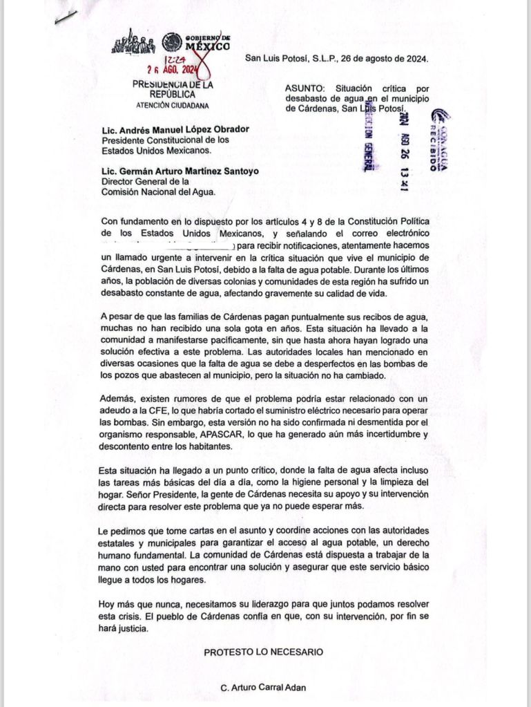 Ante la falta de atención de autoridades municipales y estatales, Arturo Carral Adán, excandidato al Senado de la República por Movimiento Ciudadano (MC), solicitó al Presidente, Andrés Manuel López Obrador, intervenga en Cárdenas, San Luis Potosí, para solucionar la grave crisis que por falta de agua potable, viven los habitantes de ese lugar.
