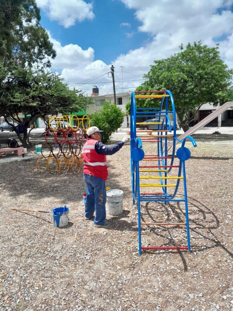 Se trabajó en esta ocasión en la recolección de excedentes y mantenimiento de áreas verdes en la calle Pómex, con mantenimiento del área verde, así como en la calle Líbano, con pintura en juegos y arreglos.