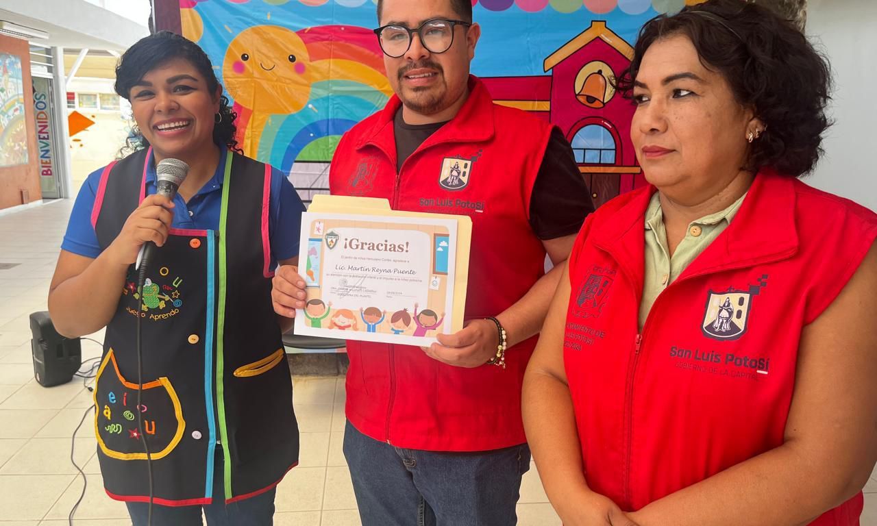 La comunidad escolar del Jardín de Niños Herculano Cortés entregó el Reconocimiento por la Atención a la Población Infantil y el impulso a la Niñez Potosina, por la serie de obras que se han realizado en la colonia Popular, donde está asentada la institución educativa, que han impactado notablemente en la calidad de vida de los vecinos de la zona, más aún en las niñas, niños, madres y padres de familia pertenecientes a esta comunidad escolar, señaló la directora de la institución, Janeth Gallegos al hacer entrega de la distinción.