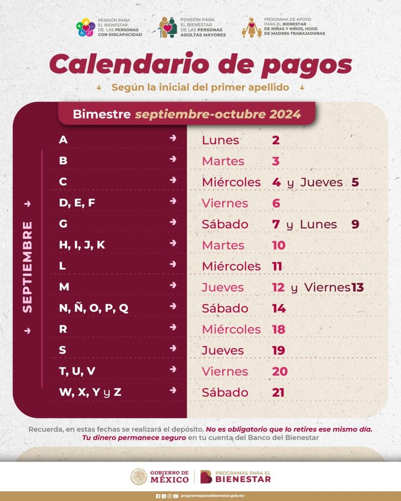 El pago de los programas corresponde al bimestre septiembre-octubre, mismo, que se realizará directamente a la tarjeta del Banco del Bienestar de los beneficiarios. El calendario de pago para los depósitos se llevará a cabo de la siguiente manera: