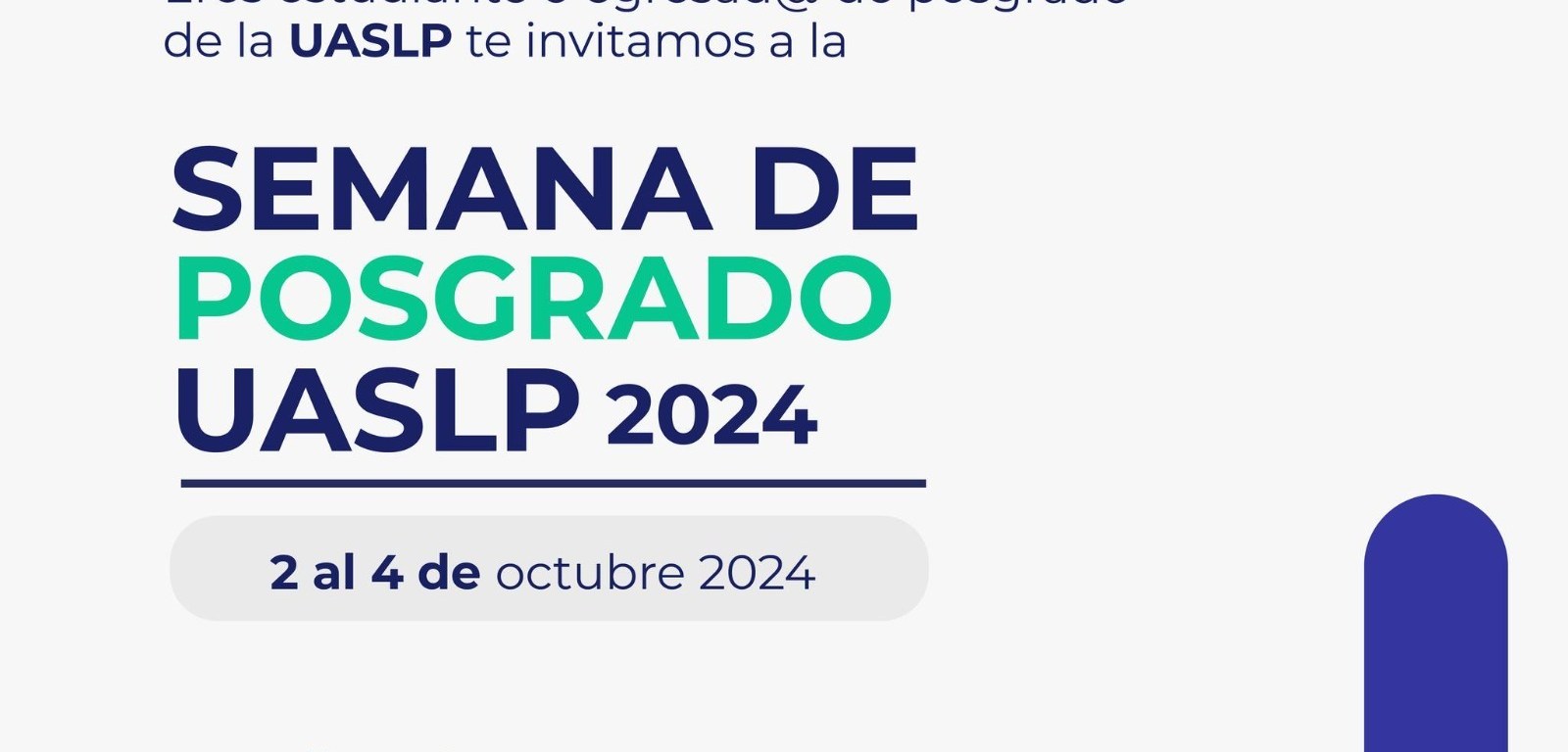 A través de la Secretaría de Investigación y Posgrado, la Universidad Autónoma de San Luis Potosí (UASLP) convoca a las y los estudiantes y egresados de la institución, a la Semana de Posgrado UASLP 2024, que en su tercera edición, se realizará del 2 al 4 de octubre en las instalaciones del Centro Cultural Universitario Bicentenario.