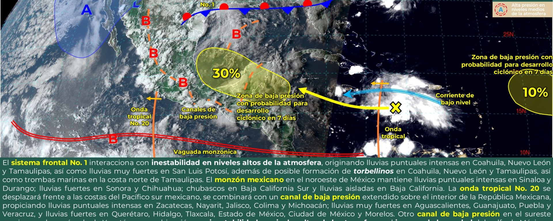 Intervalos de chubascos con lluvias puntuales fuertes (25 a 50 mm): Sonora, Chihuahua, Zacatecas, Aguascalientes, San Luis Potosí, Guanajuato, Querétaro, Hidalgo, Puebla, Tlaxcala, Estado de México, Ciudad de México y Morelos.
