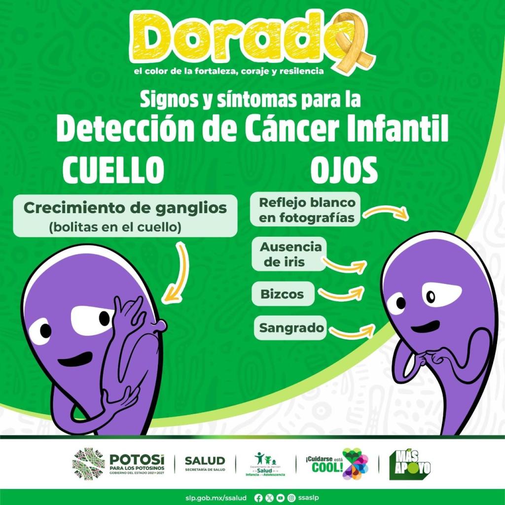 Indicó que en el estado, el Hospital Central “Dr. Ignacio Morones Prieto” es quien diagnóstica y brinda tratamiento para los diferentes tipos de cánceres “dentro de los cuales se encuentran leucemias (cáncer en células de la sangre), linfomas (afectan el tejido linfático) y tumores del sistema nervioso central”, y explicó que la mayoría de los tipos de cáncer presentan signos y síntomas inespecíficos, por ello, es importante llevar a los niños dos veces al año a la Unidad de Salud para que a través del control de niño sano, se realice una búsqueda de signos y síntomas de sospecha de cáncer.