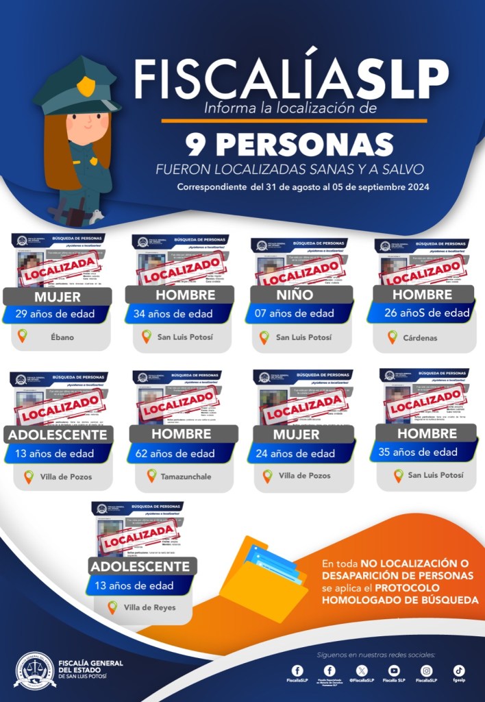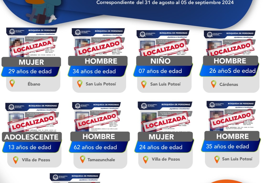 Entre el 31 de agosto y el 5 de septiembre de 2024, la Fiscalía General del Estado de San Luis Potosí (FGESLP) ubicó a nueve personas que habían sido reportadas como no localizadas o desaparecidas en diversos municipios de la entidad potosina.