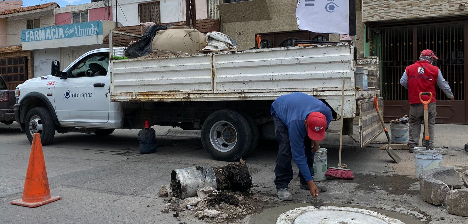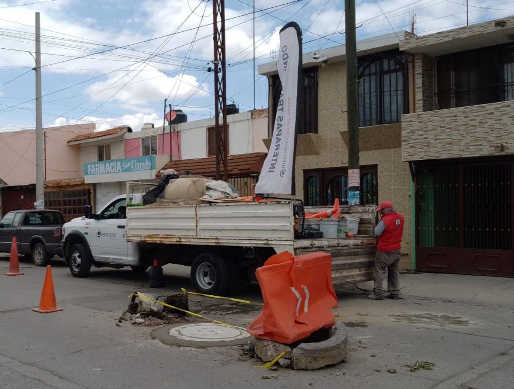 SLP.- El Nuevo Interapas además de seguir brindando servicios de agua en coordinación con el Ayuntamiento de la Capital, mantiene trabajos de bacheo y reposición de tapas de visita en la demarcación de Villa de Pozos.