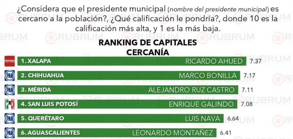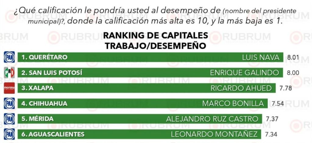 El Alcalde San Luis Capital, Enrique Galindo Ceballos, mantiene buenas calificaciones en el Ranking de Capitales de la encuestadora Rubrum, en la evaluación ciudadana de trabajo y desempeño, con una calificación de 8.0, lo que lo ubica en la segunda posición a nivel nacional, según los resultados correspondientes al mes de septiembre.