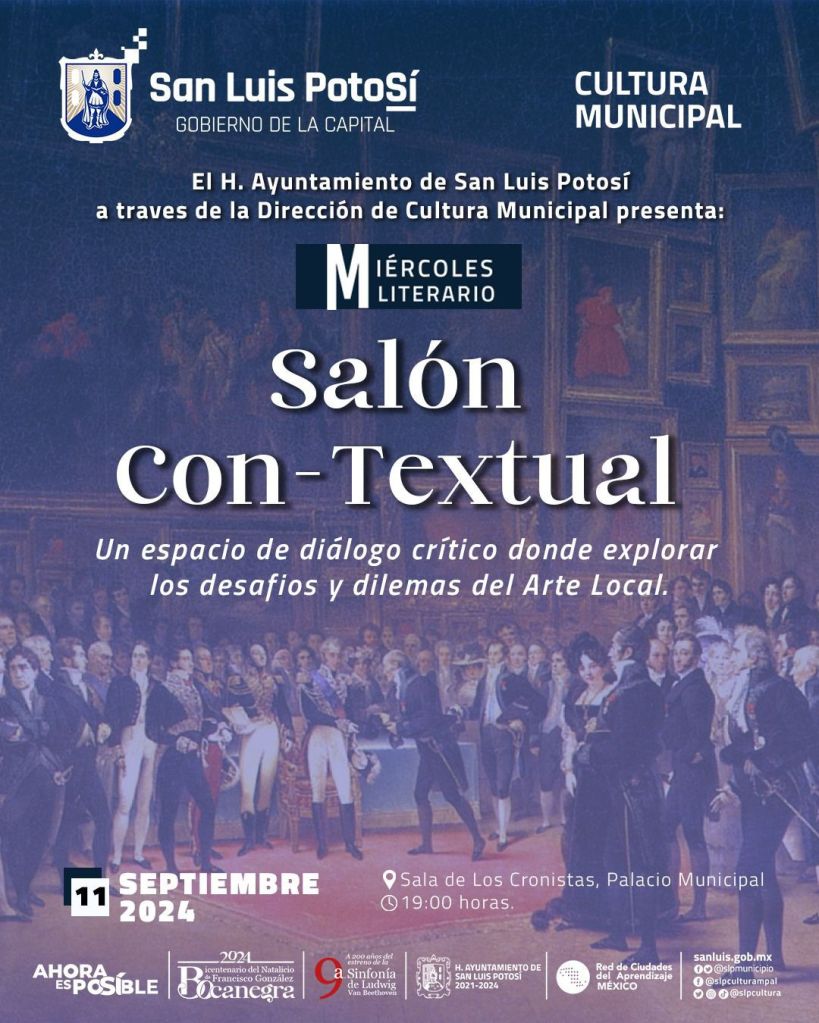 El Gobierno Municipal de San Luis Potosí, a través de la Dirección de Cultura, invita a la comunidad artística y al público en general a ser parte del próximo Miércoles Literario, que en esta ocasión presenta un evento especial denominado «Salón Con-Textual: Diálogos sobre los desafíos del Arte Contemporáneo».