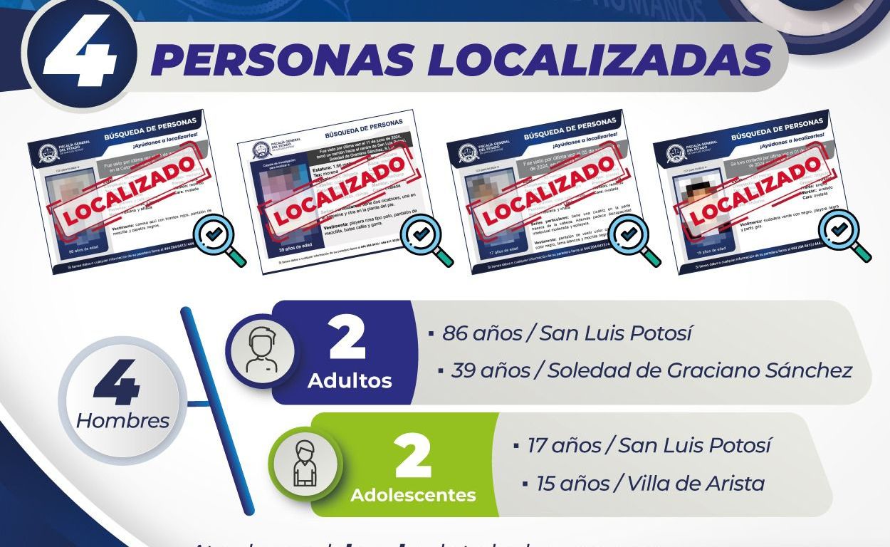 La Fiscalía General del Estado de San Luis Potosí (FGESLP) informó que, en las últimas 48 horas, localizó a cuatro personas para las cuales había fichas de búsqueda activas en territorio potosino.