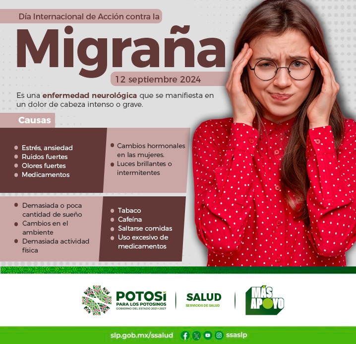 En el marco del Día Internacional de Acción contra la Migraña, conmemorado el 12 de septiembre, el Hospital Central «Dr. Ignacio Morones Prieto» informa sobre esta condición neurológica que afecta a la población y que puede ser tratada de manera efectiva si se diagnostica a tiempo. La Dra. Adriana Patricia Martínez Mayorga, jefa del servicio de neurología del Hospital Central “Ignacio Morones Prieto”, dijo que la migraña se caracteriza por dolores de cabeza intensos, generalmente en un solo lado de la cabeza, que pueden durar entre 4 y 72 horas. Entre los síntomas más frecuentes se encuentran el dolor pulsátil, náuseas, vómitos y la sensibilidad extrema a la luz y al sonido. “Algunos pacientes experimentan auras, es decir, destellos de luz, puntos ciegos o dificultad para hablar antes de que comience el dolor” expresa.