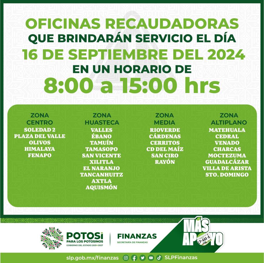 Las oficinas recaudadoras que ofrecerán servicio en la zona metropolitana son: Soledad II, Olivos, Plaza del Valle, Himalaya y Fenapo; en la región Huasteca estarán disponibles las oficinas en Ciudad Valles, Ébano, Tamuín, Tamasopo, San Vicente, Xilitla, El Naranjo, Tancanhuitz, Axtla de Terrazas y Aquismón. En la región Media se mantendrán con atención las oficinas de Ciudad del Maíz, Cerritos, Rioverde, Cárdenas, Rayón y San Ciro de Acosta. Mientras que en el Altiplano habrá atención en Guadalcázar, Matehuala, Cedral, Venado, Charcas, Moctezuma, Santo Domingo y Villa de Arista.