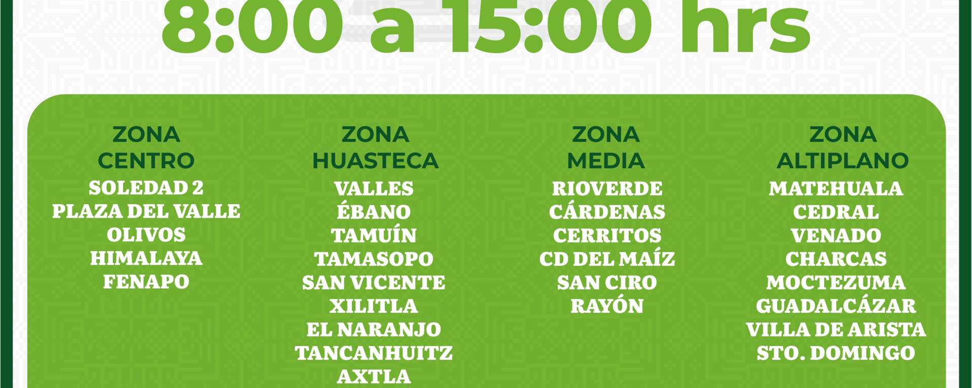Las oficinas recaudadoras que ofrecerán servicio en la zona metropolitana son: Soledad II, Olivos, Plaza del Valle, Himalaya y Fenapo; en la región Huasteca estarán disponibles las oficinas en Ciudad Valles, Ébano, Tamuín, Tamasopo, San Vicente, Xilitla, El Naranjo, Tancanhuitz, Axtla de Terrazas y Aquismón. En la región Media se mantendrán con atención las oficinas de Ciudad del Maíz, Cerritos, Rioverde, Cárdenas, Rayón y San Ciro de Acosta. Mientras que en el Altiplano habrá atención en Guadalcázar, Matehuala, Cedral, Venado, Charcas, Moctezuma, Santo Domingo y Villa de Arista.