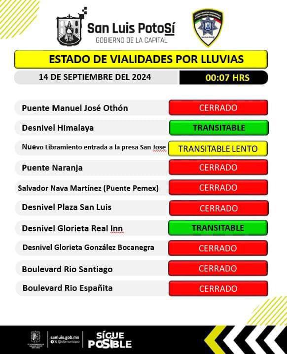 La Dirección de Policía Vial informa que, con cierre a las 23:15 horas, se encuentran cerrados a la circulación Puente Pemex, Puente Naranja, Desnivel Plaza San Luis, Río Españita, Puente Othón, Av. Universidad y Río Santiago.