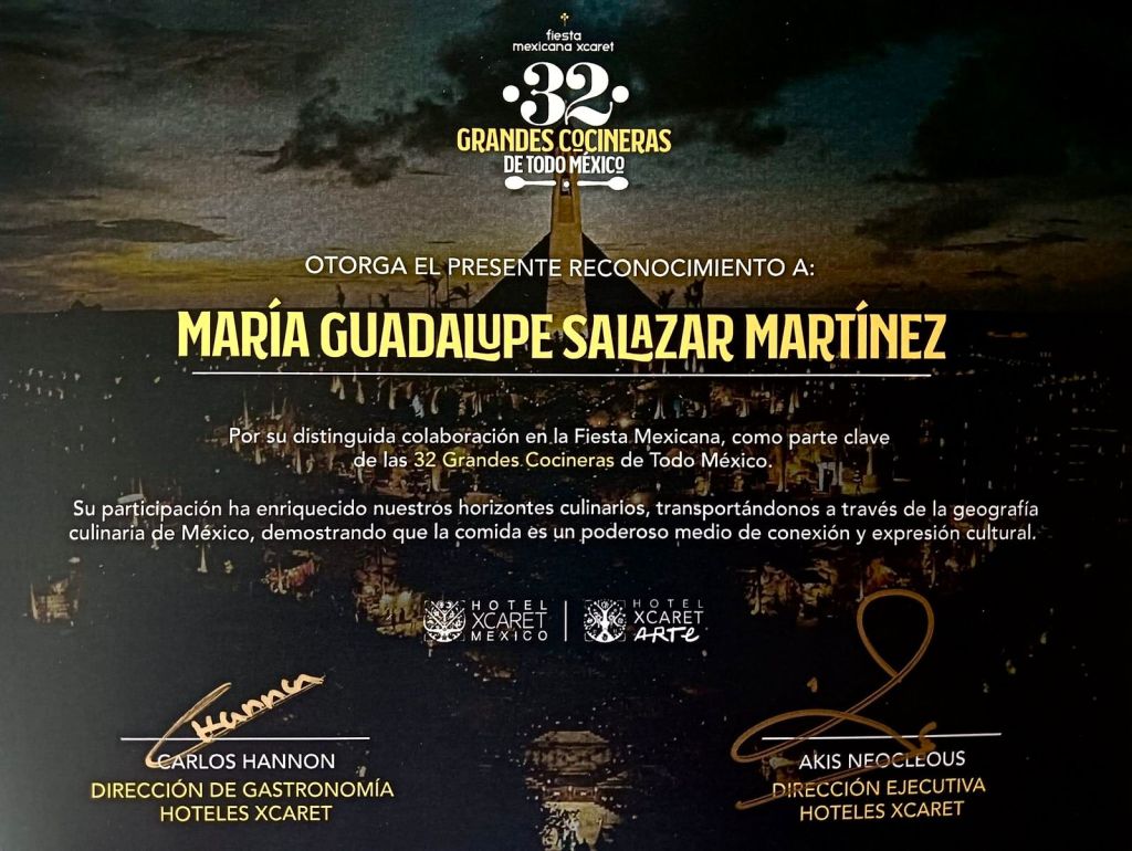 Con la receta de la tostada borracha, María Guadalupe Salazar Martínez de Moctezuma recibió una distinción por parte de la cadena de Hoteles Xcaret