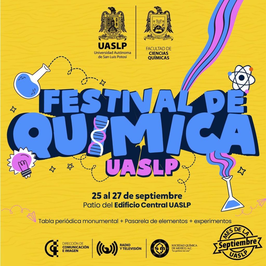 Como parte de las actividades de Septiembre, Mes de la UASLP, del 25 al 27 de septiembre, la Facultad de Ciencias Químicas (FCQ) de la Universidad Autónoma de San Luis Potosí (UASLP) llevará a cabo la segunda edición del Festival de Química, por lo que se invita a las y los potosinos, a conocer de manera interactiva y lúdica los fundamentos y aplicaciones de esta área del conocimiento.