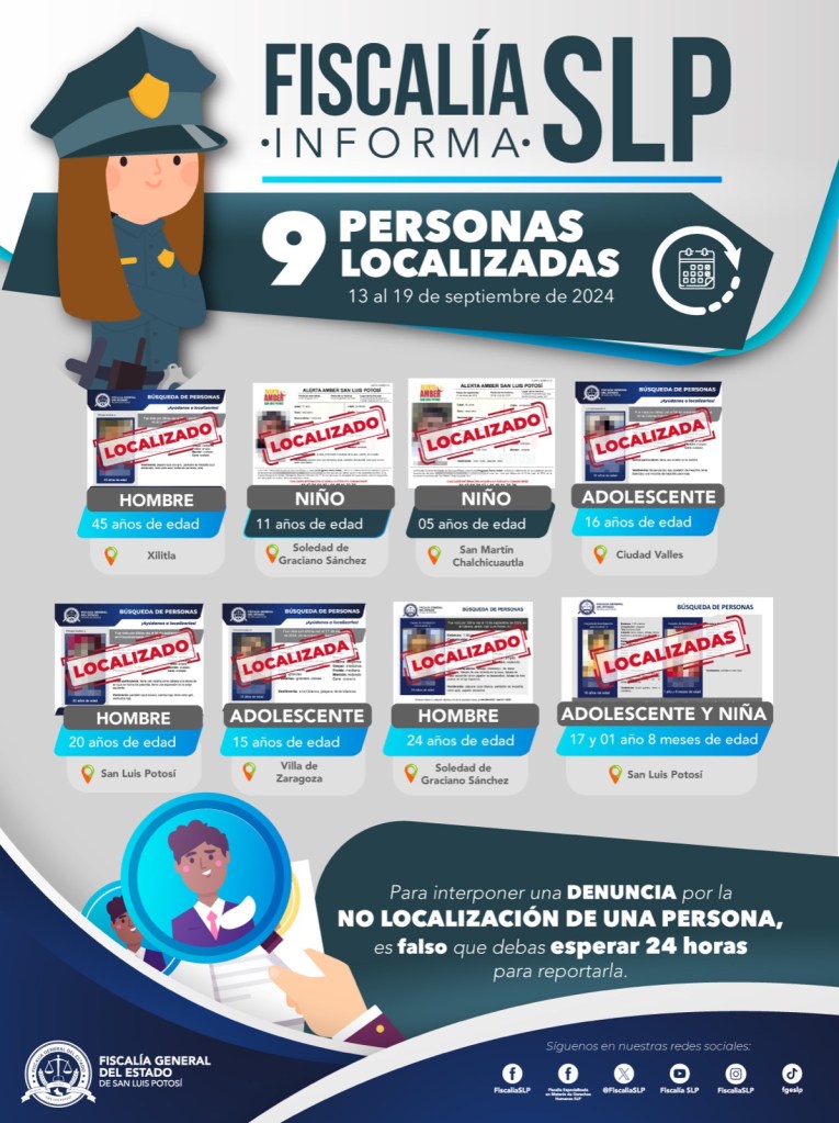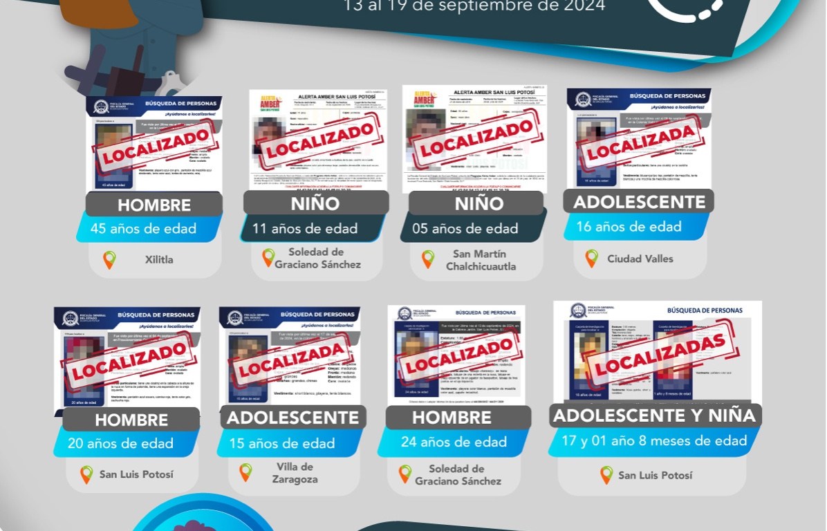 Durante el período del 13 al 19 de septiembre de 2024, la Fiscalía General del Estado de San Luis Potosí (FGESLP) ubicó a nueve personas que habían sido reportadas como no localizadas o desaparecidas en varios municipios de la entidad.