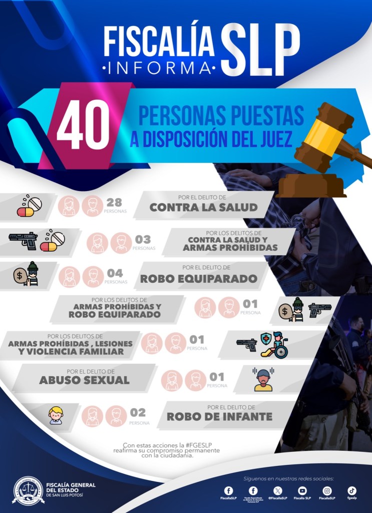 La Fiscalía General del Estado de San Luis Potosí (FGESLP) puso a disposición de un juez de control a 40 personas detenidas por delitos contra la salud, posesión de armas prohibidas, robo equiparado, abuso sexual, violencia familiar y robo de infante.