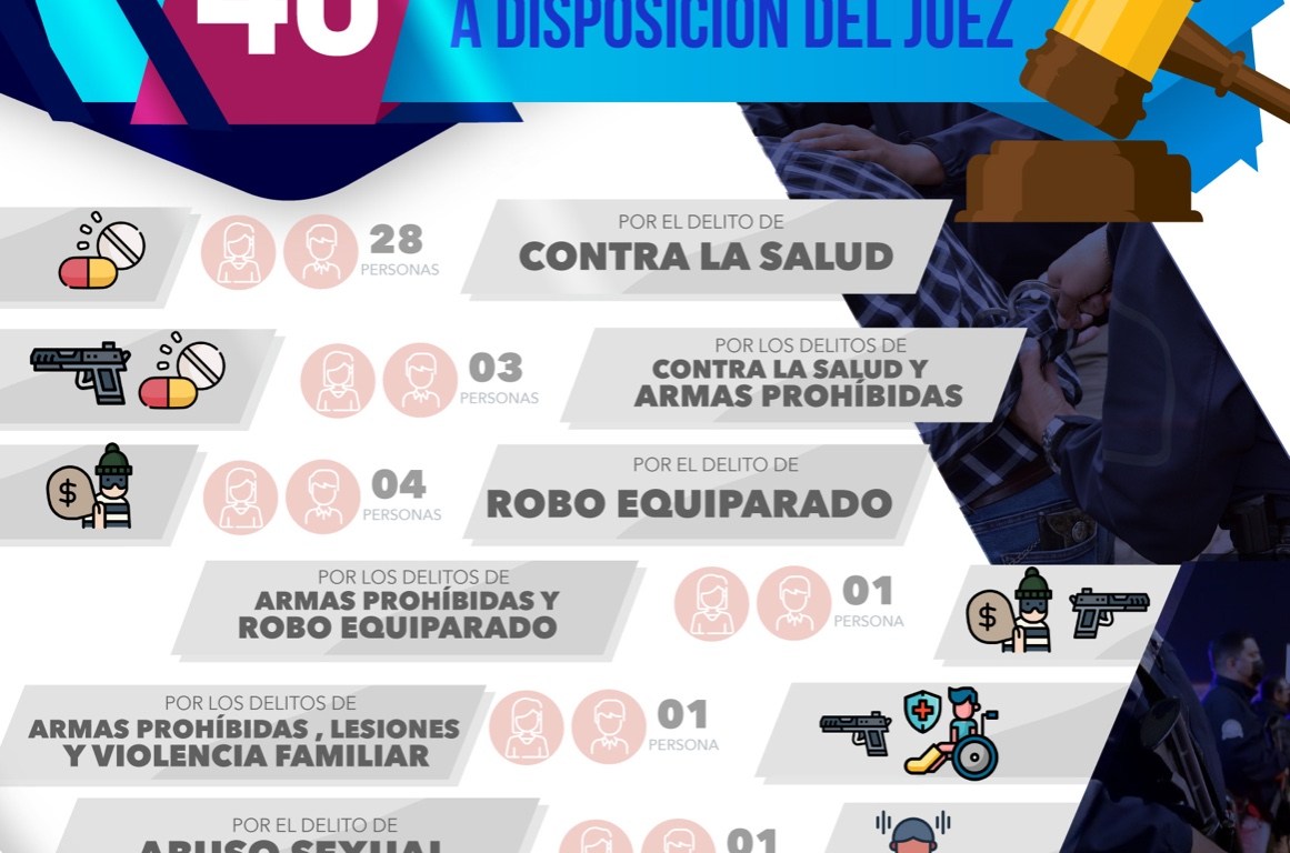 La Fiscalía General del Estado de San Luis Potosí (FGESLP) puso a disposición de un juez de control a 40 personas detenidas por delitos contra la salud, posesión de armas prohibidas, robo equiparado, abuso sexual, violencia familiar y robo de infante.