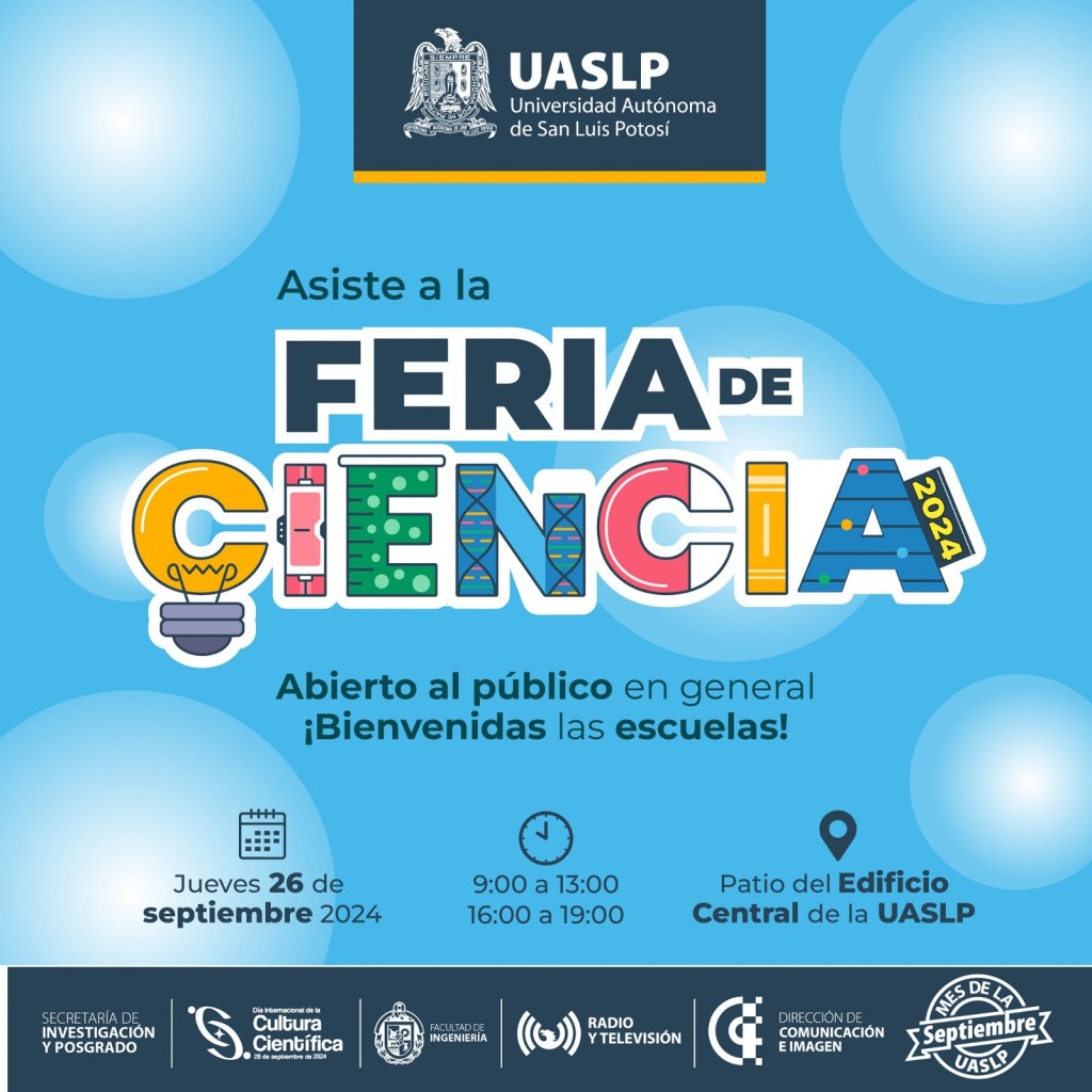 Cada 28 de septiembre se celebra el Día Internacional de la Cultura Científica (DICC), por lo que este año, la Universidad Autónoma de San Luis Potosí (UASLP) llevará a cabo la “Feria de Ciencia”, en la que se podrá disfrutar de diversas actividades de divulgación, dirigidas a estudiantes de educación básica y media superior, así como público en general.