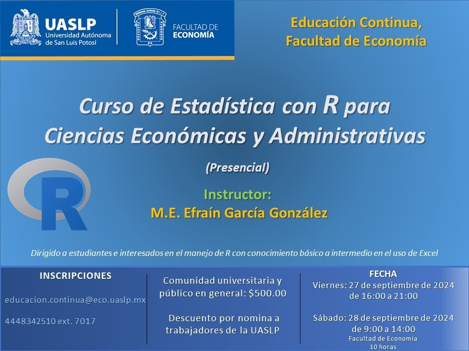 La Facultad de Economía de la Universidad Autónoma de San Luis Potosí (UASLP) llevará a cabo el curso “Estadística con R para Ciencias Económicas y Administrativas”, los días 27 y 28 de septiembre, dirigido a estudiantes e interesados en el manejo del lenguaje R, con conocimiento básico a intermedio en el uso de Excel.