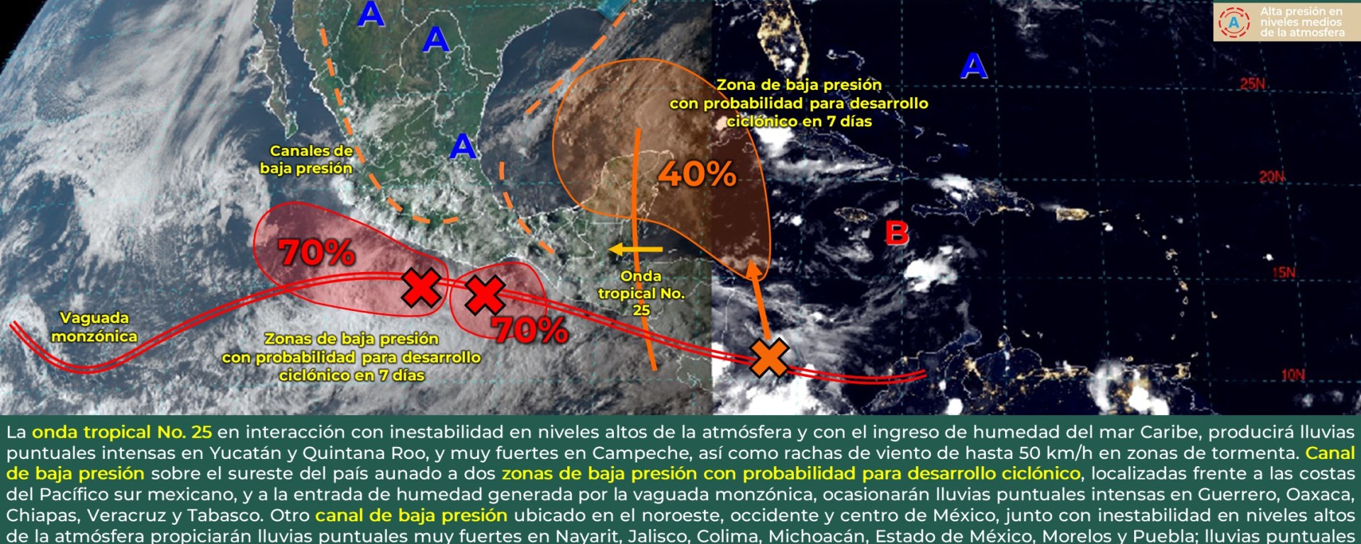 Intervalos de chubascos con lluvias puntuales fuertes (25 a 50 mm): Nayarit, Jalisco, Colima, Estado de México, Ciudad de México, Morelos y Quintana Roo.