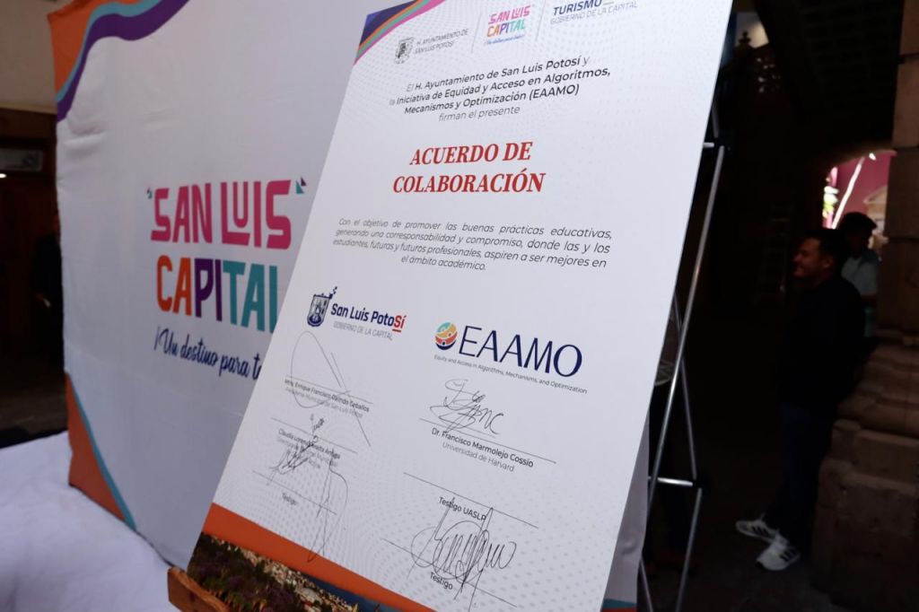 En el tercer día de la nueva gestión del Alcalde Enrique Galindo Ceballos, el Ayuntamiento de San Luis Capital inició una nueva colaboración internacional con la Universidad de Harvard para potenciar la justicia social y mejores oportunidades para las y los potosinos, con la firma del Acuerdo con la Iniciativa de Equidad y Acceso en Algoritmos, Mecanismos y Optimización (EAAMO), que fortalece el acceso a oportunidades para comunidades históricamente desatendidas, a través de técnicas de algoritmos, optimización y diseño de mecanismos, y métodos de las ciencias sociales y estudios del área de las humanidades.