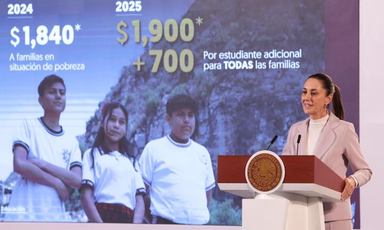»Pasamos de un millón 100 a 5.6 millones de beneficiarios en el 2025, la beca que daba, o que se da hasta ahora, la Benito Juárez, solamente en preparatoria es por estudiante. En el caso de las Benito Juárez para educación básica, preescolar, primaria, y secundaria, es por familia. Entonces se dan mil 840 pesos a la familia, independiente si tiene un hijo, dos hijos, tres hijos, cuatro hijos. Entonces, ¿qué vamos a hacer? Dar un adicional a la familia por cada hijo que tenga adicional. Entonces son mil 900 de base a la familia, si tienen dos hijos, pues será mil 900 más 700; si tienen tres hijos, mil 900, más mil 400; ese es el esquema de la beca Rita Cetina», explicó.