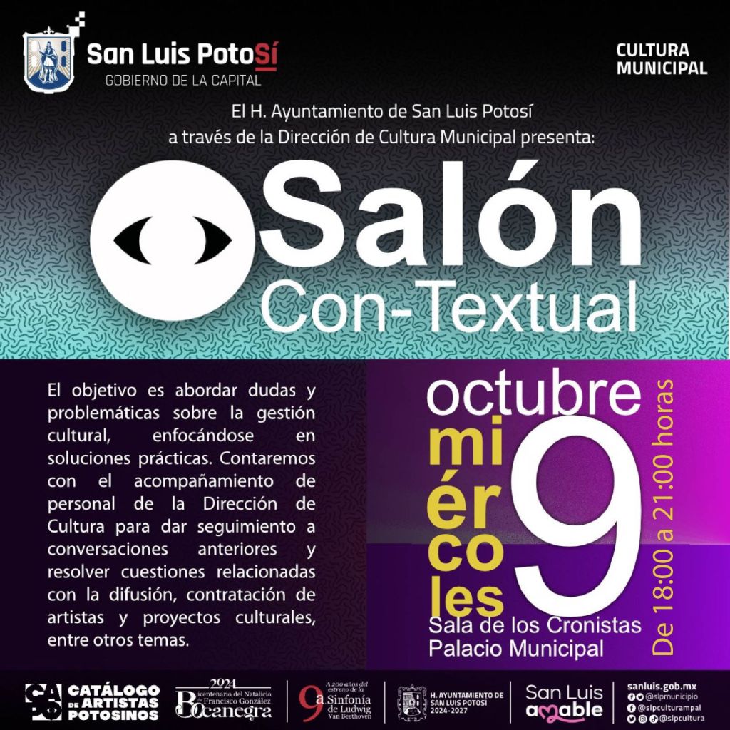 Con la finalidad de crear espacios de interacción, la Dirección de Cultura del Gobierno Municipal de San Luis Potosí invita a la comunidad artística y al público en general a ser parte del próximo «Salón Con-Textual: Diálogos sobre los desafíos del Arte Contemporáneo”, a celebrarse el miércoles 9 de octubre a las 18:00 horas, en la Sala de Los Cronistas del Centro Cultural Palacio Municipal. La entrada es libre.